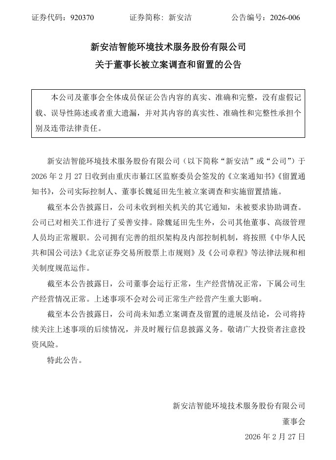 新安洁智能环境技术服务股份有限公司(简称:新安洁)公告称,公司于2026年2月27日收到由重庆市綦江区监察委员会签发的《立案通知书》《留置通知书》,公司实际控制人、董事长魏延田先生被立案调查和实施留置措施。