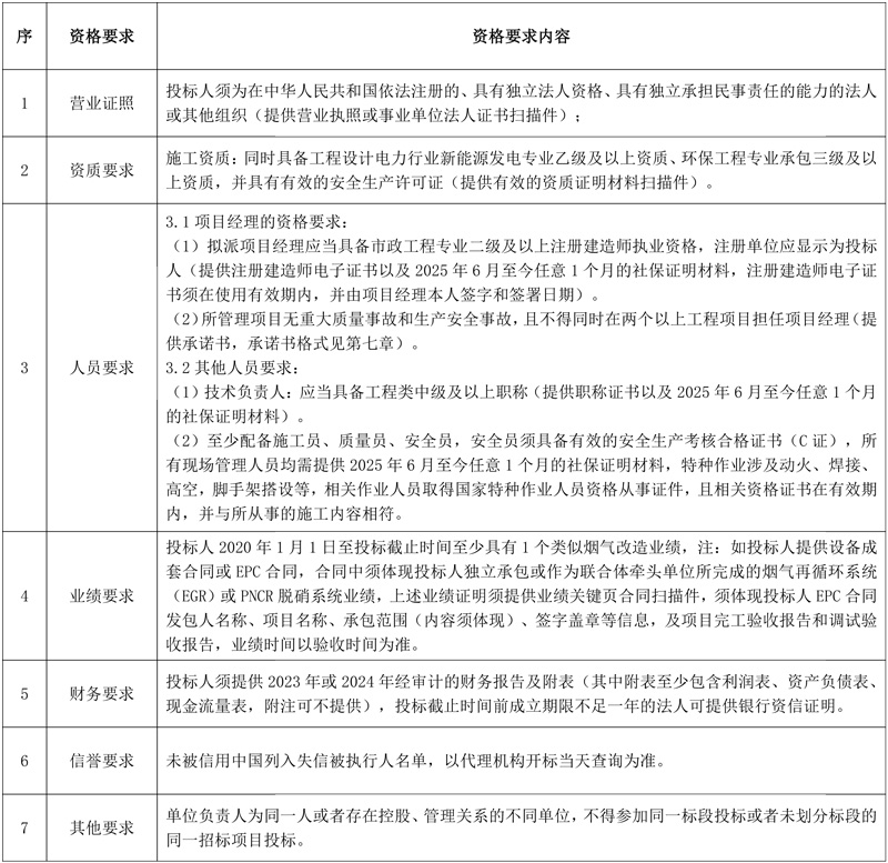 7.采购内容:本工程范围为中节能(咸宁崇阳)环保能源有限公司烟气提标改造项目的烟气再循环系统(EGR)和PNCR脱硝系统和小苏打脱酸系统的功能设计、结构、性能、制造、供货、安装、调试、试运行、培训、技术服务、检验和质量保证等交钥匙工程,具体要求详见招标文件。