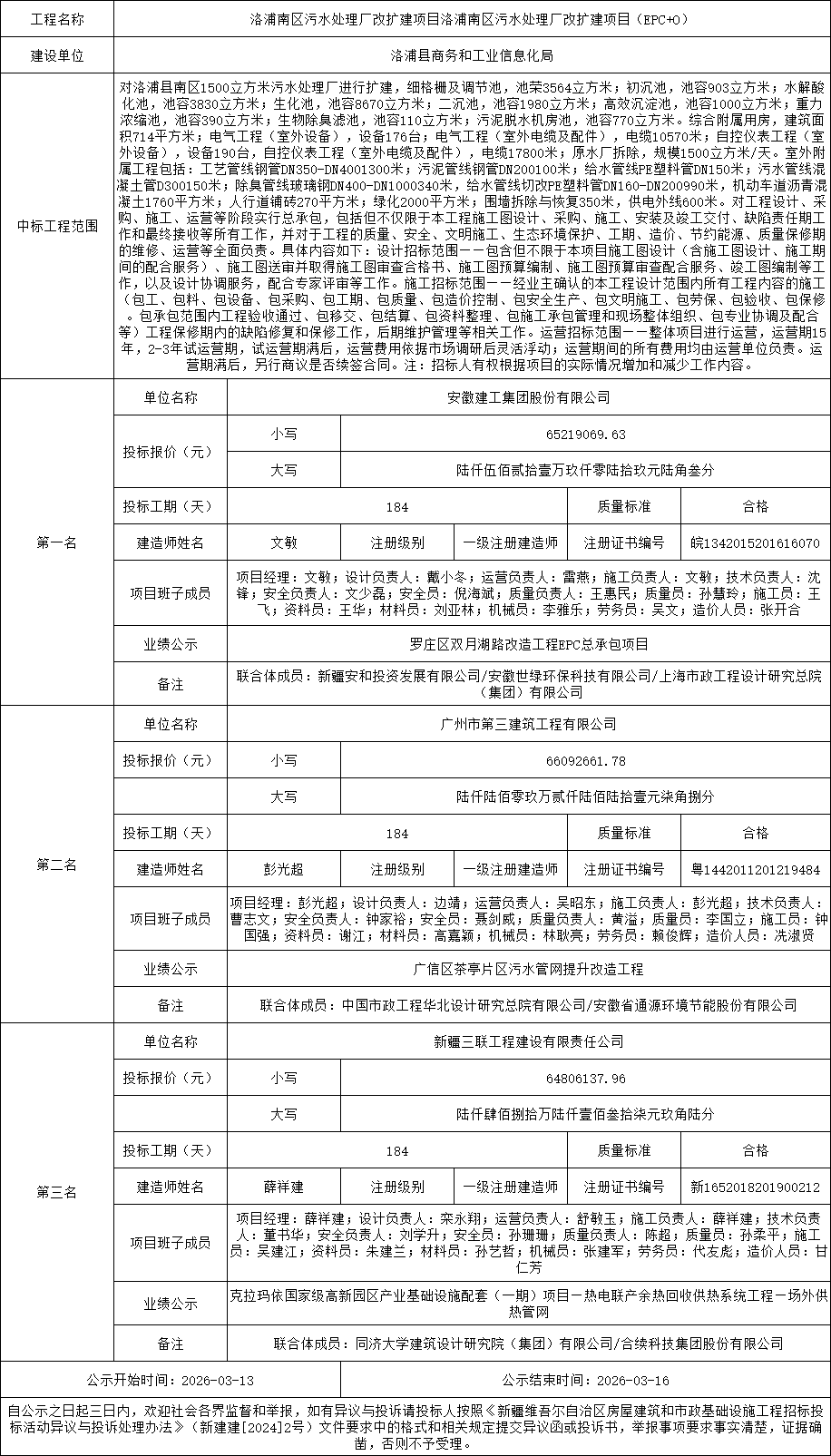 中标候选人第一名:安徽建工集团股份有限公司、新疆安和投资发展有限公司、安徽世绿环保科技有限公司、上海市政工程设计研究总院(集团)有限公司,投标报价:65219069.63元;
