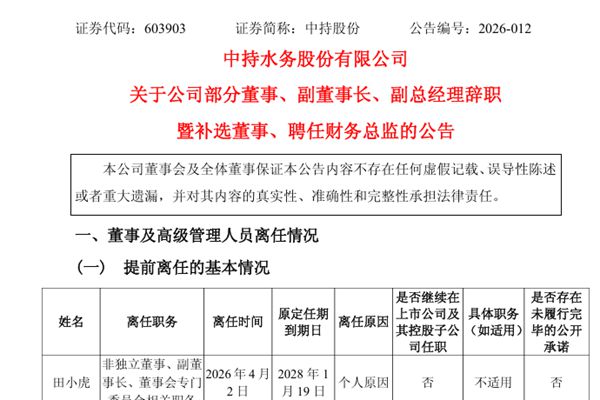 此外,中持股份董事会还收到了副总经理丁锴先生的辞职报告,因个人原因,副总经理丁锴先生辞任公司副总经理职务,其辞职报告自送达董事会时生效。丁锴先生辞职后,将不在公司担任任何职务。