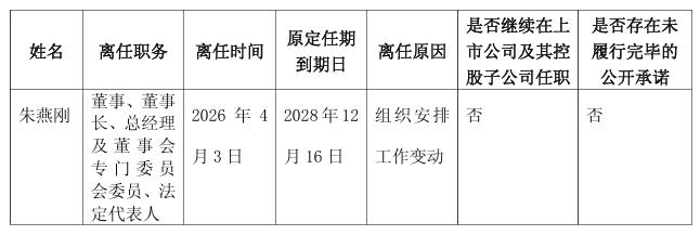 浙江钱江生物化学股份有限公司(简称:钱江生化)公告称,公司董事会于2026年4月3日收到公司董事长朱燕刚先生的书面辞职报告。因组织安排工作变动,朱燕刚先生申请辞去公司董事、代表公司执行公司事务的董事、董事长、总经理及董事会专门委员会委员职务,并不再担任公司法定代表人。辞职后,朱燕刚先生将不再担任公司任何职务。截至本公告披露日,朱燕刚先生未持有公司股份,不存在应当履行而未履行的承诺事项。