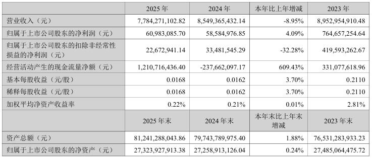 北京碧水源科技股份有限公司(简称:碧水源)近日正式发布《2025年年度报告》。报告期内,碧水源实现营业收入77.84亿元,同比下降8.95%。净利润6098.31万元,同比增长4.09%。公司经本次董事会审议通过的利润分配预案为:以36.24亿股为基数,向全体股东每10股派发现金红利0.04元(含税),送红股0股(含税),以资本公积金向全体股东每10股转增0股。