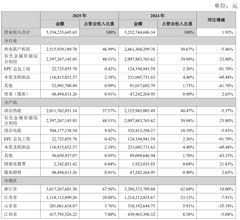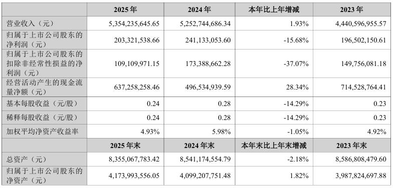 浙江富春江环保热电股份有限公司(简称:富春环保)近日正式印发《2025年年度报告》。报告期内,富春环保实现营业总收入53.54亿元,同比增长1.93%,净利润2.03亿元,同比下降15.68%,基本每股收益为0.24元。