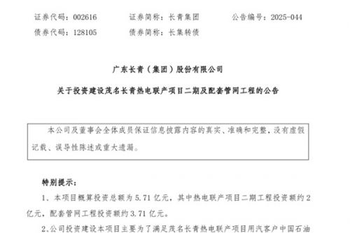 广东长青(集团)股份有限公司(简称:长青集团)近日公告称,为了满足茂名长青热电联产项目用汽客户中国石油化工股份有限公司茂名分公司的扩产及其下游配套产业蒸汽需求,公司拟投资建设茂名长青热电联产项目二期及配套管网工程,概算投资总额为5.71亿元,其中热电联产项目二期工程投资额约2亿元,配套管网工程投资额约3.71亿元。 长青集团提示,由于双方在《蒸汽供应合同》中对基础用汽量和蒸汽价格