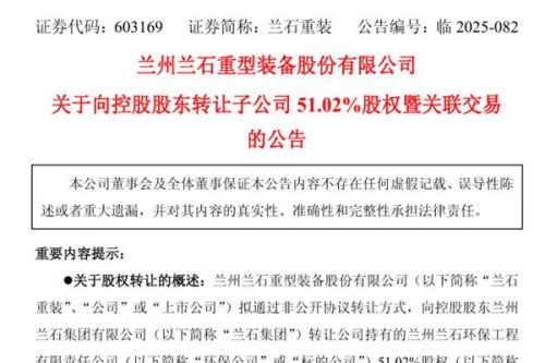 10月22日晚间, 兰州兰石重型装备股份有限公司(简称:兰石重装)发布公告称,公司拟通过非公开协议转让方式,向控股股东兰州兰石集团有限公司(下称“兰石集团”)转让公司持有的兰州兰石环保工程有限责任公司(下称“环保公司”)51.02%股权,本次交易价款总金额为1,439.08万元,转让完成后兰石重装将不再持有环保公司股权。 图源:兰石重装