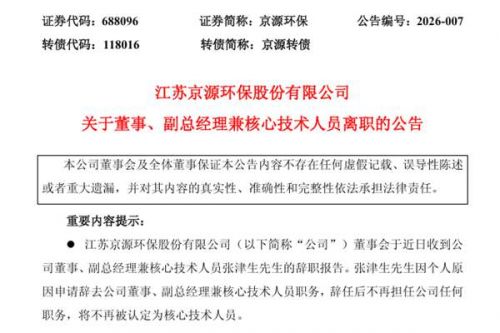 江苏京源环保股份有限公司(简称:京源环保)公告称,公司董事会于近日收到公司董事、副总经理兼核心技术人员张津生先生的辞职报告。张津生先生因个人原因申请辞去公司董事、副总经理兼核心技术人员职务,辞任后不再担任公司任何职务,将不再被认定为核心技术人员。 据悉,张津生先生与京源环保签有保密协议和竞业限制合同,负有相应的保密义务和竞业限制义务。 (一)董事、副总经理兼核心技术