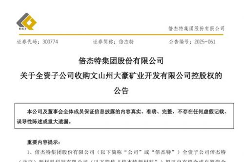 11月19日晚间,上市水处理企业倍杰特集团股份有限公司(简称:倍杰特)公告称,全资子公司倍杰特(北京)新材料科技有限公司(下称“倍杰特新材料”)拟以自有资金或自筹资金22,480.00万元收购汤玮、龙岩市小娘坑矿业有限公司(简称“小娘坑矿业”)、王育才合计持有的文山州大豪矿业开发有限公司(下称“大豪矿业”)55%股权。本次