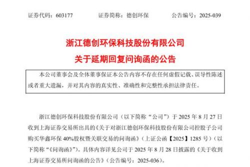 浙江德创环保科技股份有限公司(简称:德创环保)公告称,公司于2025年8月27日收到上海证券交易所出具的《关于对浙江德创环保科技股份有限公司控股子公司购买华鑫环保40%股权暨关联交易的问询函》(上证公函【2025】1285号)(下称《问询函》),为确保回复内容的准确性、完整性,经申请,公司拟延期不超过5个交易日回复《问询函》,并按照规定履行信息披露义务。 据悉,《问询函》中要求德