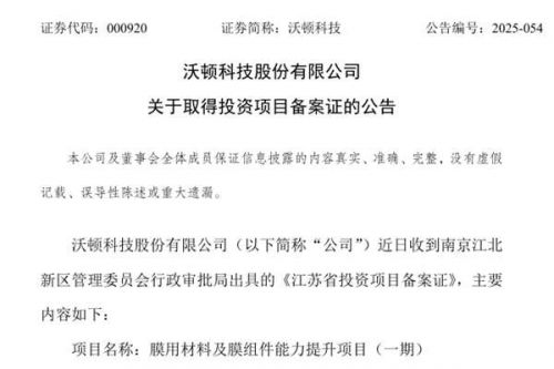 10月9日,沃顿科技股份有限公司(简称:沃顿科技)公告称,公司已收到南京江北新区管理委员会行政审批局出具的《江苏省投资项目备案证》,主要内容如下: 项目名称:膜用材料及膜组件能力提升项目(一期) 项目法人:沃顿科技股份有限公司 建设地点:江苏省南京市江北新区新材料科技园 项目总投资:55,000万元 沃顿科技表示,本次公告事