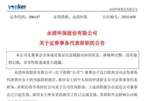 永清环保股份有限公司(简称:永清环保)公告称,公司董事会于近日收到公司证券事务代表黄田女士的书面辞职报告,黄田女士因个人原因申请辞去公司证券事务代表职务,辞职后将不再担任公司及子公司任何职务。目前,黄田女士所负责的相关工作已完成交接,其辞职不会影响公司相关工作的正常运行。 图源:永清环保公告 公开资料显示,永清环保成立于2004年,已在美国亚特兰大、北京、上海、南京等多