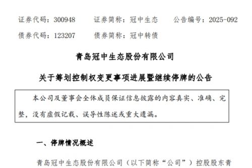 2025年9月22日,主营土壤修复、水环境治理的冠中生态发布停牌公告。主因系青岛冠中生态股份有限公司控股股东青岛冠中投资集团有限公司及实际控制人李春林先生和许剑平女士正在筹划公司控制权变更相关事宜,该事项可能导致公司控股股东及实际控制人发生变更。经公司向深圳证券交易所申请,公司股票及可转换公司债券自2025年9月22日(星期一)开市起停牌,预计停牌时间不超过2个交易日。停牌期间,公司可转换公司