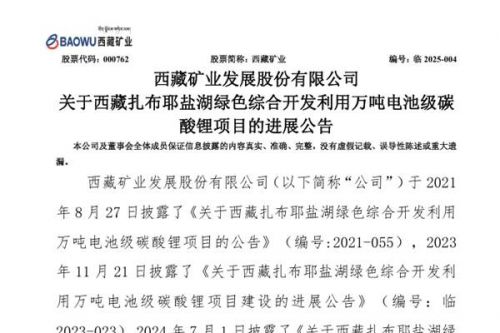 9月25日晚间,西藏矿业发展股份有限公司(简称:西藏矿业)公告称,西藏扎布耶盐湖绿色综合开发利用万吨电池级碳酸锂项目,于2025年9月20—24日顺利完成120小时的功能考核,标志着该项目正式投产。该项目属于大型工业装置,系全球首套采用膜分离+MVR盐湖提锂工艺的项目,涉及较为复杂的技术调试、环境适配和产品验证等,同时地处高寒地带,面临艰苦建设条件。 资料显示,西藏扎