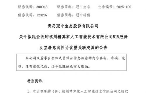 青岛冠中生态股份有限公司(简称:冠中生态)近日公告称,公司与杭州精算家人工智能技术有限公司(下称“杭州精算家”)的11名股东签署了《意向协议》,拟以支付现金的方式收购杭州精算家51%的股权。本次收购的标的公司整体估值暂定为不高于56,000万元。 冠中生态表示,本次签订的意向协议系各方基于收购事项达成的初步一致,具体交易方案、交易金额以最终签署的正式收购协