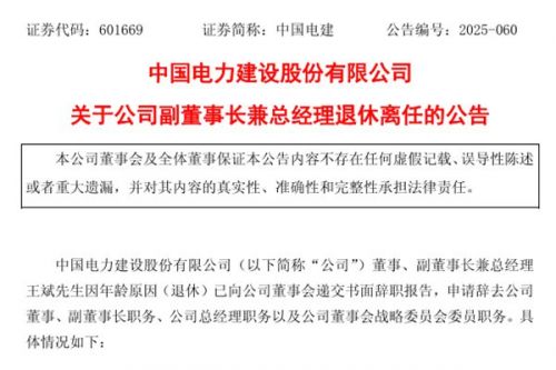 中国电力建设股份有限公司(简称:中国电建)公告称,公司董事、副董事长兼总经理王斌先生因年龄原因(退休)已向公司董事会递交书面辞职报告,申请辞去公司董事、副董事长职务、公司总经理职务以及公司董事会战略委员会委员职务。 图源:中国电建公告 申明:本站发布此信息的目的在于传播更多行业信息,相关数据仅供参考,不构成投资建议。环保在线力求但不保证数据的完全准确,如有错漏请以中国证