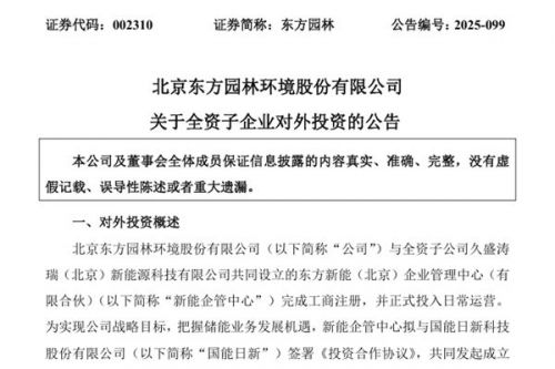 北京东方园林环境股份有限公司(简称:东方园林)近日公告称,公司与全资子公司久盛涛瑞(北京)新能源科技有限公司共同设立的东方新能(北京)企业管理中心(有限合伙)(下称“新能企管中心”)完成工商注册,并正式投入日常运营。 据悉,为实现公司战略目标,把握储能业务发展机遇,新能企管中心拟与国能日新科技股份有限公司(下称“国能日新”)签署《投