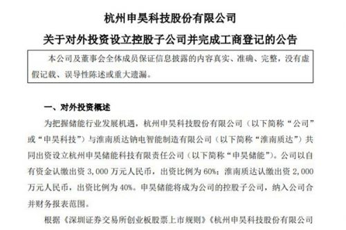 2024年7月11日,杭州申昊科技股份有限公司发布关于对外投资设立控股子公司并完成工商登记的公告。 杭州申昊科技股份有限公司与淮南质达钠电智能制造有限公司共同出资设立杭州申昊储能科技有限责任公司。 对外投资的目的:在国家大力支持储能行业发展的政策背景下,公司投资设立申昊储能从事包 括户储、工商业储能、电网侧储能等业务,拟研发虚拟电网技术和应用,进一步提升储能资源的聚