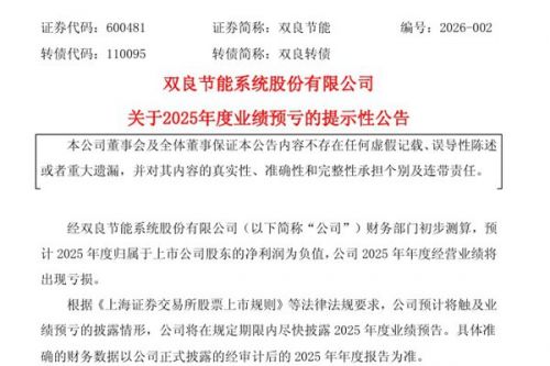 双良节能系统股份有限公司(简称:双良节能)近日发布《关于2025年度业绩预亏的提示性公告》。报告期内,双良节能预计2025年度归属于上市公司股东的净利润为负值,公司2025年年度经营业绩将出现亏损。 双良节能表示,根据《上海证券交易所股票上市规则》等法律法规要求,公司预计将触及业绩预亏的披露情形,公司将在规定期限内尽快披露2025年度业绩预告。具体准确的财务数据以公司正式披露的经