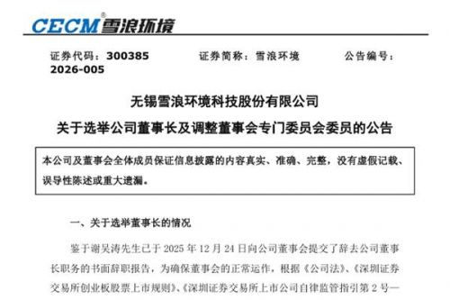 无锡雪浪环境科技股份有限公司(简称:雪浪环境)公告称,2026年1月12日,公司召开的第五届董事会第二十七次会议审议通过了《关于选举公司第五届董事会董事长的议案》,董事会同意选举蔡道远先生(简历详见附件)为公司董事长,任期自本次董事会审议通过之日起至第五届董事会任期届满之日止。 蔡道远先生,中国国籍,无境外永久居留权,1991年1月出生,东南大学会计学专业毕业,硕士学历,中国注册