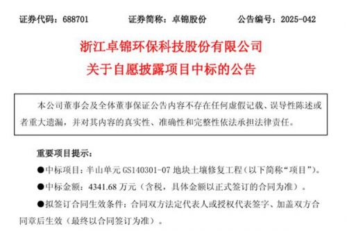 浙江卓锦环保科技股份有限公司(简称:卓锦股份)近日公告称,根据中标候选人公示,公司为半山单元GS140301-07地块土壤修复工程项目中标人。 项目基本情况 1.中标项目名称:半山单元GS140301-07地块土壤修复工程 2.中标金额:4341.68 万元(含税) 3.工期:330日历天(最终以合同签订为准) 4.招标单位