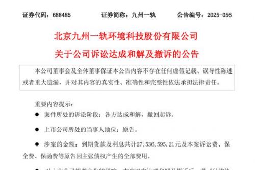 北京九州一轨环境科技股份有限公司(简称:九州一轨)公告称,公司于近日收到北京市房山区人民法院出具的《北京市房山区人民法院民事裁定书》【案号:(2025)京0111民初27540号】,基于长期友好合作基础,公司与中铁三局集团有限公司就前述案件达成和解,签署《付款协议》,法院准予撤诉。 涉案的金额:到期货款及利息共计27,536,595.21元及本案诉讼费、保全费、保函费等原告因主张