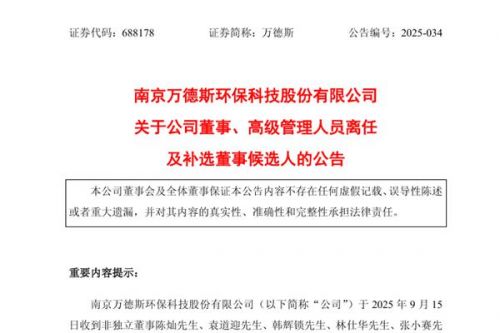 南京万德斯环保科技股份有限公司(简称:万德斯)公告称,公司近日收到非独立董事陈灿先生、袁道迎先生、韩辉锁先生、林仕华先生、张小赛先生、副总经理李春泉、财务总监张开圣的书面辞职报告。 陈灿先生因工作调整向公司董事会提出辞去公司第四届董事会战略委员会委员职务,但其仍在公司担任董事、总经理; 袁道迎先生因工作调整向公司董事会提出辞去公司第四届董事会董事及审计委员会委员职务