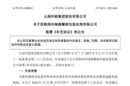 山高环能集团股份有限公司(简称:山高环能)近日发布关于收购郑州绿源餐厨垃圾处理有限公司签署《补充协议》的公告,增加项目餐厨废弃物处理服务费调整应对方案、支付安排、股权转让对价调整等相关内容。详情如下↓ 1、如政府投资审计调整本项目餐厨废弃物处理服务费(包括收运费/补贴及处置费/补贴,下同)标准,该调整政策导致2025年至2027年三个完整的自然年度内目标公司开展特许经营