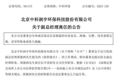 北京中科润宇环保科技股份有限公司(简称:中科环保)公告称,公司董事会于近日收到副总经理邵德洲先生提交的《辞职报告》,因工作调动,特向董事会提出辞去副总经理职务。邵德洲先生离任后不再担任公司任何职务。 邵德洲先生的原定任期至第二届董事会任期届满之日(2026年1月15日)。截至本公告披露日,邵德洲先生通过“富诚海富通中科环保员工参与创业板战略配售集合资产管理计划&rdq