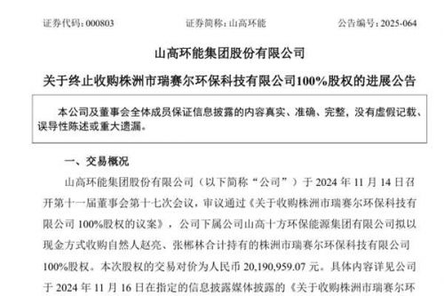 因原协议约定的交易先决条件未达成,山高环能集团股份有限公司(简称:山高环能)终止收购株洲市瑞赛尔环保科技有限公司100%股权。山高环能表示,本次收购公司未支付股权款,不存在违约情形。终止本次收购不会对公司现有经营业绩及财务状况产生不利影响,不存在损害公司及全体股东利益的情形。公司后续将继续聚焦主营业务发展,努力做好经营管理,推动公司持续健康发展。 据悉,山高环能于2024年11月