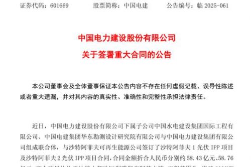 中国电力建设股份有限公司(简称:中国电建)近日公告称,下属子公司中国水电建设集团国际工程有限公司、中国电建集团华东勘测设计研究院有限公司与中国电力建设集团有限公司组成联合体,与沙特阿菲夫可再生能源公司签订了沙特阿菲夫1光伏IPP项目及沙特阿菲夫2光伏IPP项目合同,合同金额折合人民币分别约58.43亿元、58.76亿元,共117.19亿元。 两个项目均位于沙特中部地区利雅得省阿菲