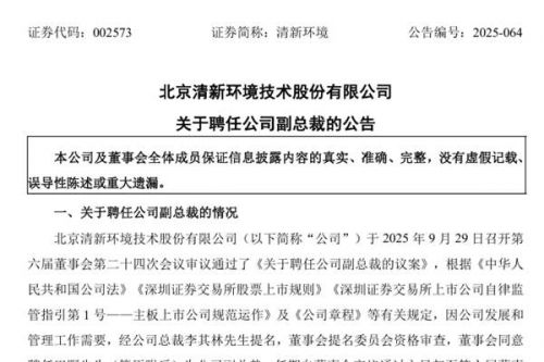 北京清新环境技术股份有限公司(简称:清新环境)近日公告称,因公司发展和管理工作需要,经公司总裁李其林先生提名,董事会提名委员会资格审查,董事会同意聘任田野先生为公司副总裁,任期自董事会审议通过之日起至第六届董事会任期届满之日止。 田野先生,出生于1986年10月,中共党员,党校研究生,高级经济师、中级工程师、二级建造师、法律职业资格A证,中国国籍,无永久境外居住权。曾任四川发展产