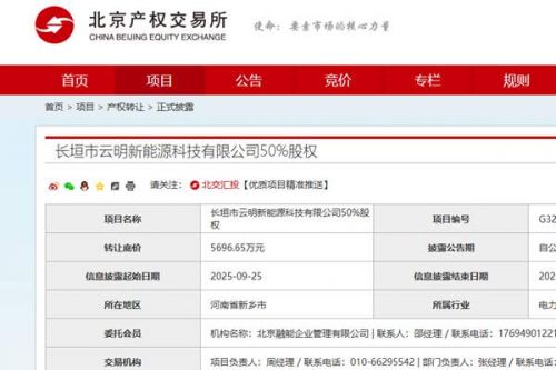 9月25日,中国三峡新能源(集团)股份有限公司在北京产权交易所挂牌转让长垣市云明新能源科技有限公司50%股权,转让底价5696.65万元。该公司由中国三峡新能源(集团)股份有限公司、北京清云能源集团有限公司各持股50%。 数据显示,长垣市云明新能源科技有限公司主营范围包括新能源科技领域内的技术开发、技术咨询、技术转让;风力发电项目、光伏发电项目的开发、建设等,2024年资产总计3