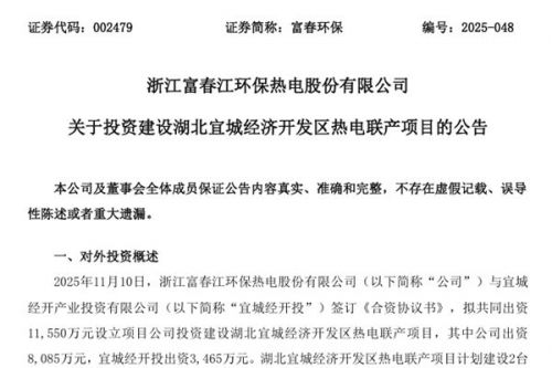 浙江富春江环保热电股份有限公司(简称:富春环保)近日公告称,公司与宜城经开产业投资有限公司(下称“宜城经开投”)签订《合资协议书》,拟共同出资11,550万元设立项目公司投资建设湖北宜城经济开发区热电联产项目,其中公司出资8,085万元,宜城经开投出资3,465万元。湖北宜城经济开发区热电联产项目计划建设2台100t/h高温超高压燃煤循环流化床锅炉配套1台12MW背压机