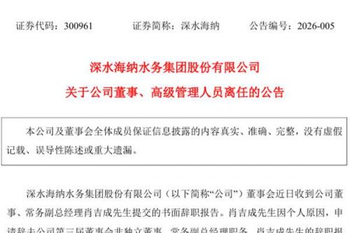 深水海纳水务集团股份有限公司(简称:深水海纳)公告称,公司董事会近日收到董事、常务副总经理肖吉成先生提交的书面辞职报告。肖吉成先生因个人原因,申请辞去公司第三届董事会非独立董事、常务副总经理职务,肖吉成先生的辞职报告自送达董事会之日起生效,肖吉成先生辞职后,将继续在公司担任其他职务,其辞职不会影响公司相关工作的正常进行。 深水海纳表示,肖吉成先生原定任期至第三届董事会届满时止。截