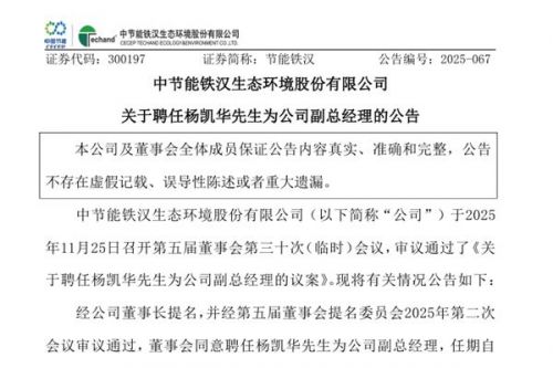 中节能铁汉生态环境股份有限公司(简称:节能铁汉)公告称,公司于2025年11月25日召开第五届董事会第三十次(临时)会议,审议通过了《关于聘任杨凯华先生为公司副总经理的议案》。经公司董事长提名,并经第五届董事会提名委员会2025年第二次会议审议通过,董事会同意聘任杨凯华先生为公司副总经理,任期自本次董事会审议通过之日起至第五届董事会届满之日止。 杨凯华,男,1975年6月出生,中