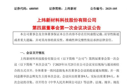 上纬新材料科技股份有限公司(简称:上纬新材)公告称,公司于2025年11月25日召开第四届董事会第一次会议,审议通过《关于选举公司第四届董事会董事长的议案》等。 ①审议通过《关于选举公司第四届董事会董事长的议案》 公司董事会选举彭志辉先生为第四届董事会董事长,任期自第四届董事会第一次会议审议通过之日起至第四届董事会任期届满之日止。 ②审议通过《关于选举