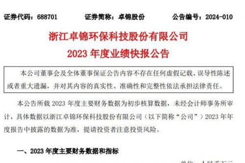 浙江卓锦环保科技股份有限公司(简称:卓锦股份)近日发布《2023 年度业绩快报》,公告营收及利润情况。报告显示,卓锦股份2023年共实现营业收入34838.46万元,较2022年同期的24582.69万元增长41.72%;归属于母公司所有者的净利 润同比减少26.78%,亏损11898.62万元,上年同期亏损9385.36万元;本报告期末总资产为70948.46万元,同比减少7.39%。&nb