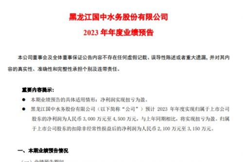 《黑龙江国中水务股份有限公司2023年年度业绩预告》发布。国中水务本期业绩预告的具体适用情形:净利润实现扭亏为盈。 黑龙江国中水务股份有限公司(以下简称“公司”)预计2023年年度实现归属于上市公司股东的净利润为人民币3,000万元至4,500万元,与上年同期相比,将实现扭亏为盈;归属于上市公司股东的扣除非经常性损益后的净利润为人民币2,100万元至3,1
