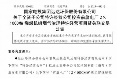 国家电投集团远达环保股份有限公司(简称:远达环保)近日公告称,为抢抓新一轮“大火电”机遇,坚持“BOT+EPC”协同推进,高质量开发火电环保特许经营项目,全资子公司重庆远达烟气治理特许经营有限公司(下称“特许经营公司”)拟成立前詹分公司依托国电投(揭阳)前詹发电有限公司(下称“前詹电厂”)2&tim