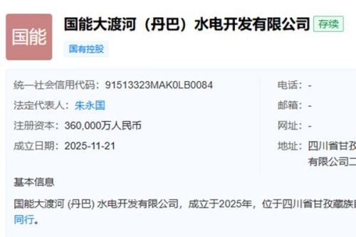 近日,国能大渡河(丹巴)水电开发有限公司成立,法定代表人为朱永国,注册资本36亿人民币,经营范围: 【许可项目】水力发电;发电业务、输电业务、供(配)电业务;建设工程施工;输电、供电、受电电力设施的安装、维修和试验。(依法须经批准的项目,经相关部门批准后方可开展经营活动,具体经营项目以相关部门批准文件或许可证件为准) 【一般项目】太阳能发电技术服务;风力发电技术服务