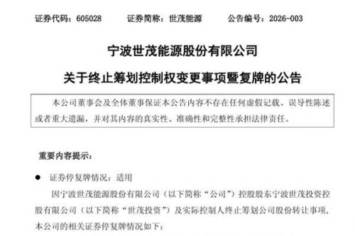 宁波世茂能源股份有限公司(简称:世茂能源)公告称,停牌期间,公司控股股东宁波世茂投资控股有限公司(以下简称“世茂投资”)及实际控制人与交易对方就筹划控制权变更事项进行了充分沟通与论证,但双方就部分核心条款未能达成一致意见,基于审慎决策原则,为切实维护公司全体股东及公司利益,相关交易方经慎重考虑、协商,决定终止筹划本次控制权变更事项,各方对终止筹划本次控制权变更事项无需承