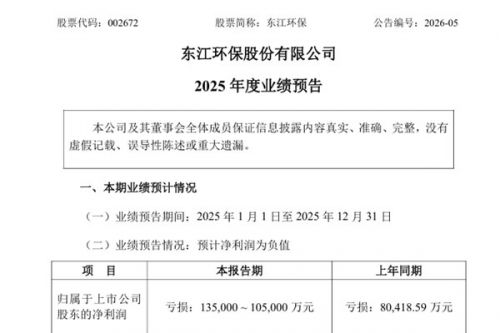 东江环保股份有限公司(简称:东江环保)近日发布《2025年度业绩预告》。报告期内,东江环保预计实现归属于上市公司股东的净利润亏损135,000 -105,000 万元,上年同期亏损80,418.59万元;扣除非经常性损益后的净利润亏损125,000 -95,000 万元;上年同期亏损80,976.81 万元;基本每股收益亏损:1.22元/股-0.95元/股,上年同期亏损0.73元/股。&nbs