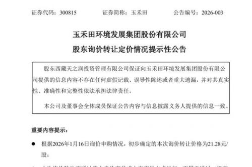 1月16日,玉禾田环境发展集团股份有限公司(简称:玉禾田)发布《股东询价转让定价情况提示性公告》,经向机构投资者询价后,初步确定的转让价格为21.28元/股。 参与本次询价转让报价的机构投资者家数为39家,涵盖了基金管理公司、证券公司、私募基金管理人、合格境外投资者等专业机构投资者。参与本次询价转让报价的机构投资者合计有效认购股份数量为35,760,000股,对应的有效认购倍数为