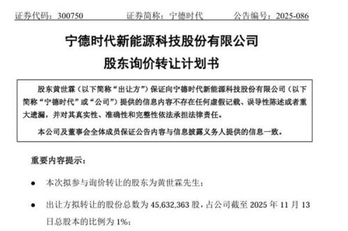 宁德时代新能源科技股份有限公司(简称:宁德时代)近日发布《股东询价转让计划书》。计划书显示,公司股东黄世霖拟参与询价转让,拟转让的股份总数为4563.24万股,占公司截至11月13日总股本的比例为1%。 图源:宁德时代公告 截至2025年11月13日,黄世霖持有宁德时代466,021,310股,占公司总股本的10.21%。其中258,900,728 股为首发前股份,20