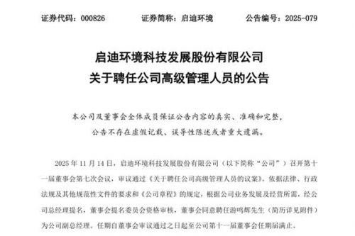 启迪环境科技发展股份有限公司(简称:启迪环境)近日公告称,根据公司业务发展及经营所需,经公司总经理提名,董事会提名委员会资格审核,董事会同意聘任游鸣辉先生为公司副总经理。任期自董事会审议通过之日起至公司第十一届董事会任期届满止。 游鸣辉先生,男,1983年出生,中国农业大学本科,华南理工大学MBA,高级人力资源管理师。2005年5月至2015年10月任北京厚德人力资源开发有限公司