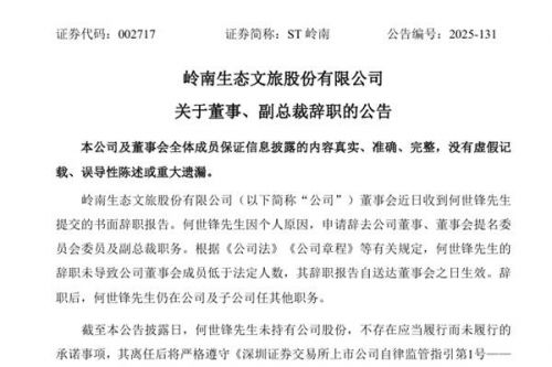 岭南生态文旅股份有限公司(简称:ST岭南)公告称,公司董事会近日收到何世锋先生提交的书面辞职报告。何世锋先生因个人原因,申请辞去公司董事、董事会提名委员会委员及副总裁职务。辞职后,何世锋先生仍在公司及子公司任其他职务。 截至本公告披露日,何世锋先生未持有ST岭南股份,不存在应当履行而未履行的承诺事项,其离任后将严格遵守《深圳证券交易所上市公司自律监管指引第1号—&md