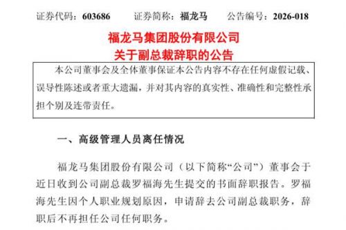 福龙马集团股份有限公司(简称:福龙马)公告称,公司董事会近日收到了副总裁罗福海先生提交的书面辞职报告。罗福海先生因个人职业规划原因,申请辞去公司副总裁职务,辞职后不再担任公司任何职务。 图源:福龙马公告 福龙马表示,罗福海先生在担任公司副总裁期间勤勉尽责、恪尽职守,在公司环境服务和智能装备的业务发展、市场拓展等方面发挥了积极作用,为公司的发展壮大付出了辛勤努力。公司及董