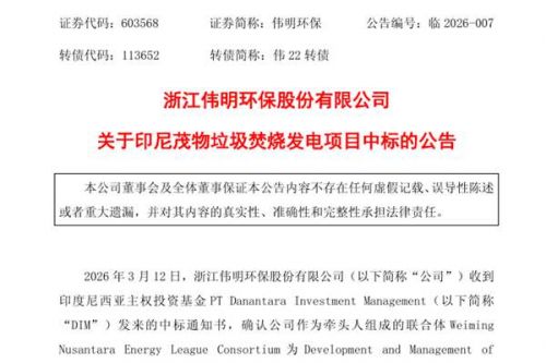 浙江伟明环保股份有限公司(简称:伟明环保)公告称,3月12日,公司收到了印度尼西亚主权投资基金PT Danantara Investment Management(以下简称“DIM”)发来的中标通知书,确认公司作为牵头人组成的联合体WeimingNusantara Energy League Consortium 为 Development and Management