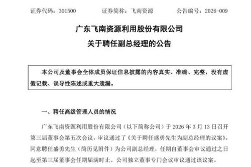 广东飞南资源利用股份有限公司(简称:飞南资源)近日公告称,公司同意聘任盛勇先生为公司副总经理,任期自董事会审议通过之日起至第三届董事会任期届满时止。公司独立董事专门会议审议通过该议案。 盛勇先生,1976年3月出生,中国国籍,无境外永久居留权,毕业于武汉大学,会计硕士,会计师。1997年7月至2002年3月历任正大集团下属公司会计、会计主任等;2002年3月至2013年7月历任中