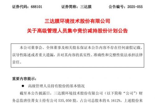 三达膜环境技术股份有限公司(简称:三达膜)近日公告称,截至本公告披露日,公司财务总监唐佳菁女士持有公司535,050股,占公司总股本的0.1612%。上述股份来源均为公司首次公开发行股票并上市前取得的股份,且已于2020年11月16日起上市流通。 因自身资金需求,公司财务总监唐佳菁女士拟自本减持股份计划公告披露之日起15个交易日后的3个月内通过集中竞价方式进行减持其持有的公司股份