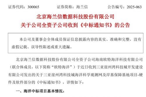 北京海兰信数据科技股份有限公司(简称:海兰信)近日公告称,全资子公司海南欧特海洋科技有限公司(联合体成员)已收到三亚崖州湾科技城开发建设有限公司发出的关于三亚崖州湾科技城海洋科学观测网及岸基保障基地项目-硬件及软件部分的《中标通知书》。 项目基本情况 1、招标项目名称:三亚崖州湾科技城海洋科学观测网及岸基保障基地项目硬件及软件部分 2、招标单位:三亚崖